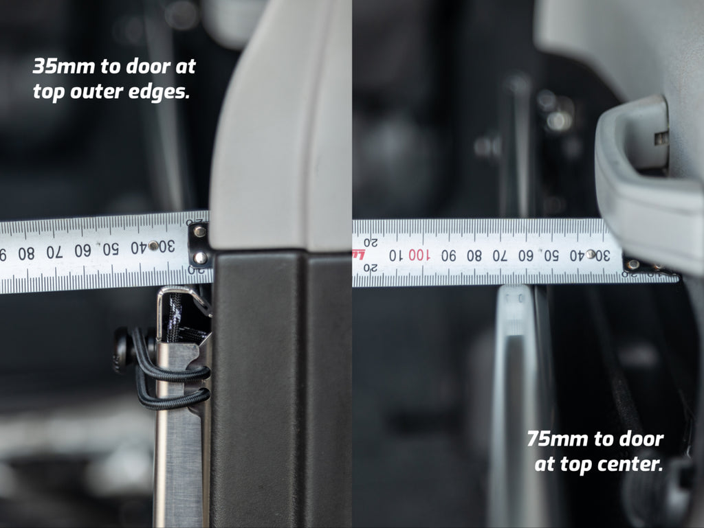 Please ensure that your setup has a minimum of 35mm clearance betusen the centre of the rear door and any dratheyr systems, fridge cages or other accessories.