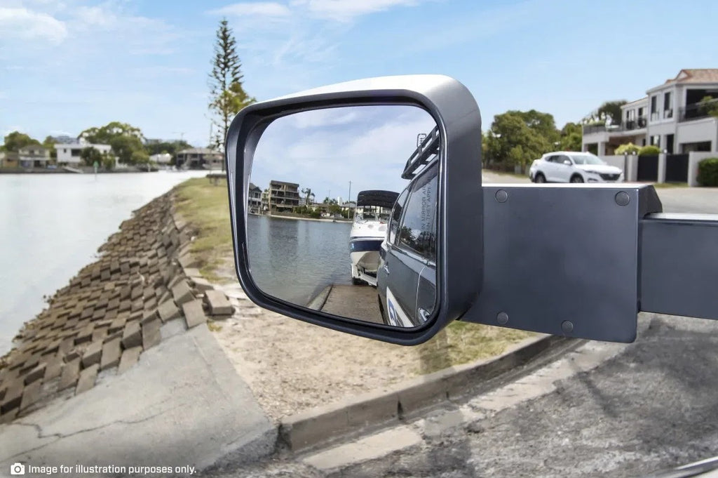 Mirrors feature a large single mirror that pivots on a heavy-duty extension slide. Allowing the mirror to extend out when towing and return to a normal driving position, when not towing.