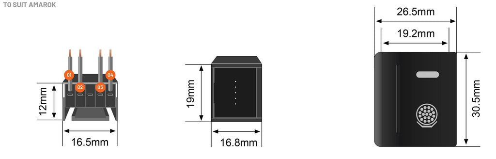 Summary: Stedi VW switches suited for the gear shifter blanks (left side only) measuring 26 x 30.5mm. Push latching type switch designed to suit Volkswagen Amarok models from 2011 to current.